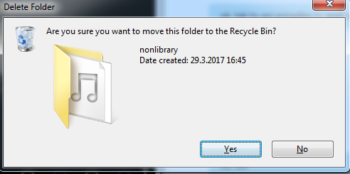 User is objecting that the default behaviour in Windows 8, 8.1 & 10 is to not show the system deletion confirmation dialog on folder deletion per http://techdows.com/2015/02/make-windows-10-display-delete-confirmation-dialog.html The user personally would rather not see the file deletion dialog and suggested for MediaMonkey to have its own option to enable or disable deletion prompts (and not rely on system wide configuration options). Probably makes sense to unify it with other delete confirmation prompts, we just don't have the strings like "recycle bin" localized. Assigned to Rusty for wording suggestions and revision. |