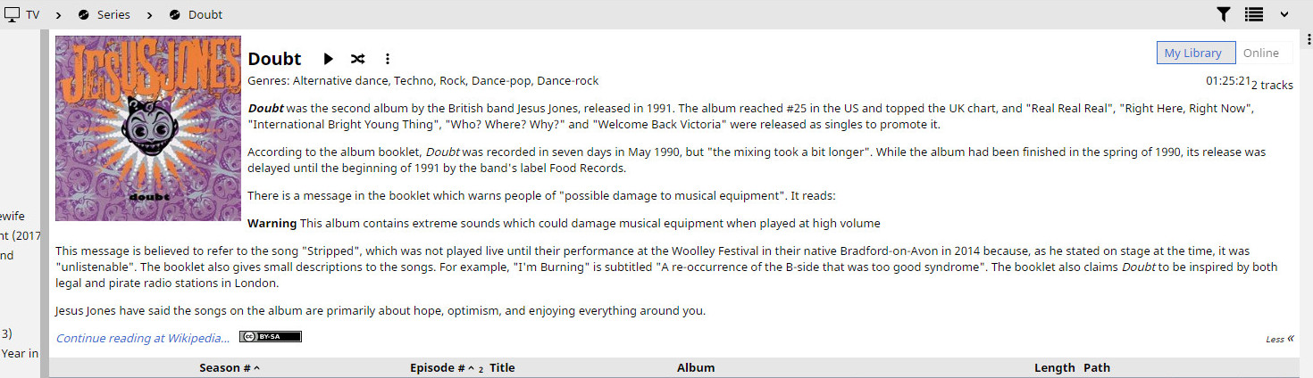 | Description | My Library Tab still fetches info from Wikipedia instead of TVDB/TVMaze See attached Pictures. | ||||