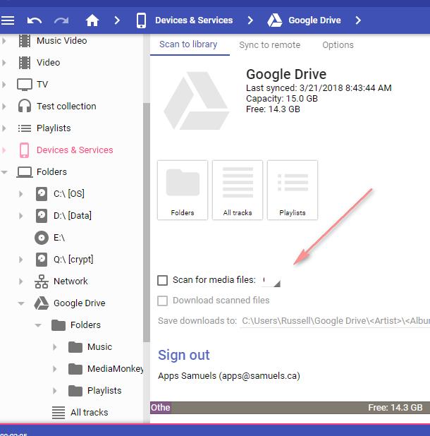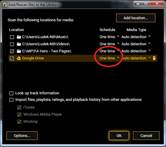re 2a/b/c) Re: "Synchronizing Google Drive: (Scanning:)" - it is there before each auto-sync, it scans the actual GDrive content before sync, but isn't scanning anything into local MM library. Maybe we could just remove [Sync now] button from the 'Scan to library' page and leave there only [Apply] to eliminate the confusion? The reason why I would leave the "One Time" option there is for compatibility with the Add/Rescan dialog (as is done according to 0014272:0049406 ) Also, starting from 2093 remote playlists are scanned into local library per 0014272:0049760 . Maybe we should adjust the string accordingly (i.e. [x] Scan for media files and playlist ) and add a tooltip so that users are aware what the scan does? |