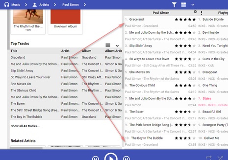 | Description | 1) If the user Sends Tracks from 'Paul Simon' to a New Playlist --> Playlists Panel opens as expected, however as can be seen in the first image, there's a strange artifact with the first track appearing twice: once at the beginning and once at the end. 2) If the user re-orders a track by drag and dropping it, the track numbering updates as expected, however, the order in which tracks are displayed changes! e.g. for 1 2 3 4 5 6 7 8 9 10, dragging track 4 to after track 5 --> display order changes to 7 10 6 1 2 5 4 3 8 9 See attached images. | ||||