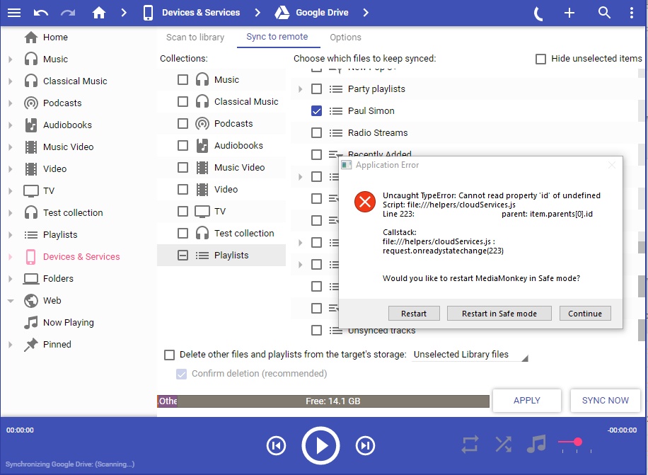 | Description | I was playing 'Searching' by the Hollies, and when that track was syncing (it was on the auto-sync list) to Google drive (while it was also playing) MM5 crashed. Note: I tried skipping the track while it was playing--that may have also contributed to the crash. Debug log: 41CE47D4 | ||||