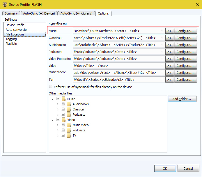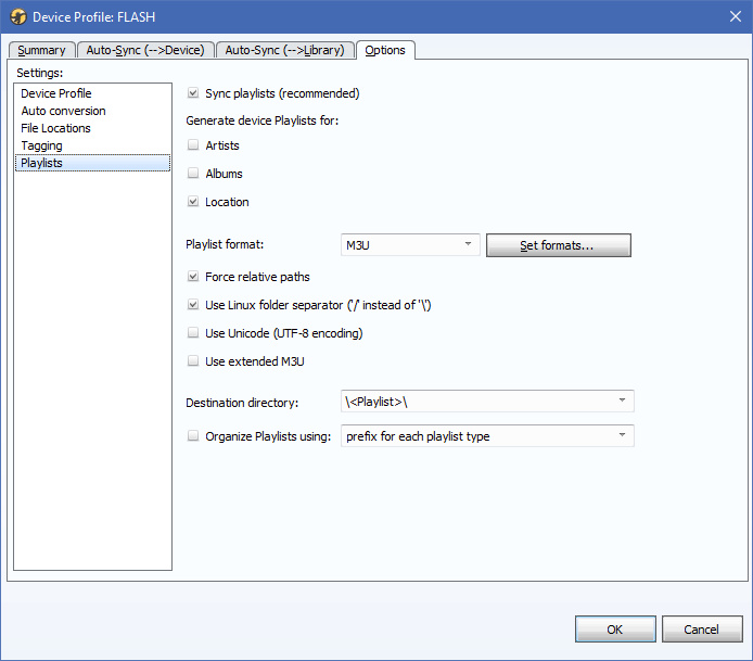 | Description | Using "\<Playlist>\" for playlist destination path in order to overcome limitations of some Car Head Units/Stereos and support playlists, a destination path for M3U playlists must be in Root of Playlists and naming must be specific to comply with filename sorting rule on some devices. Bug Consist that on sync "\<Playlist>\" is translated in "\%Q\" on Device and Playlists do not work. | ||||