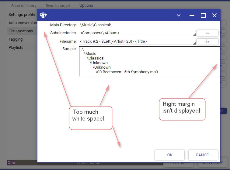 | Description | 1) In Options > Auto-conversion, the checkbox next to 'Format in Library' doesn't work 2) When double-clicking an auto-conversion rule, the window that opens as a result (auto-conversion rule) is much larger than it ought to be. 3) In File Locations, clicking 'CONFIGURE...' opens a dialog that: a) is much too large b) doesn't display the sample correctly (the border is cut off). See attached. 4) In the Playlists dialog there's a 'SET FORMATS..' button that doesn't do anything! | ||||