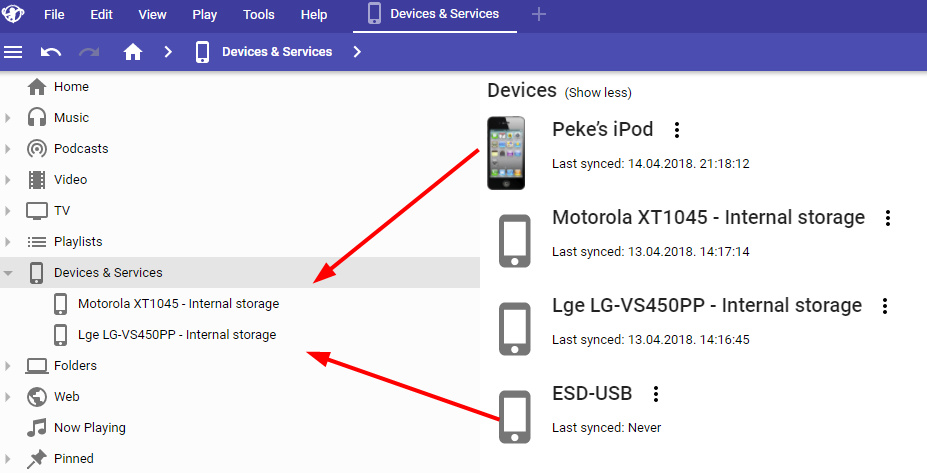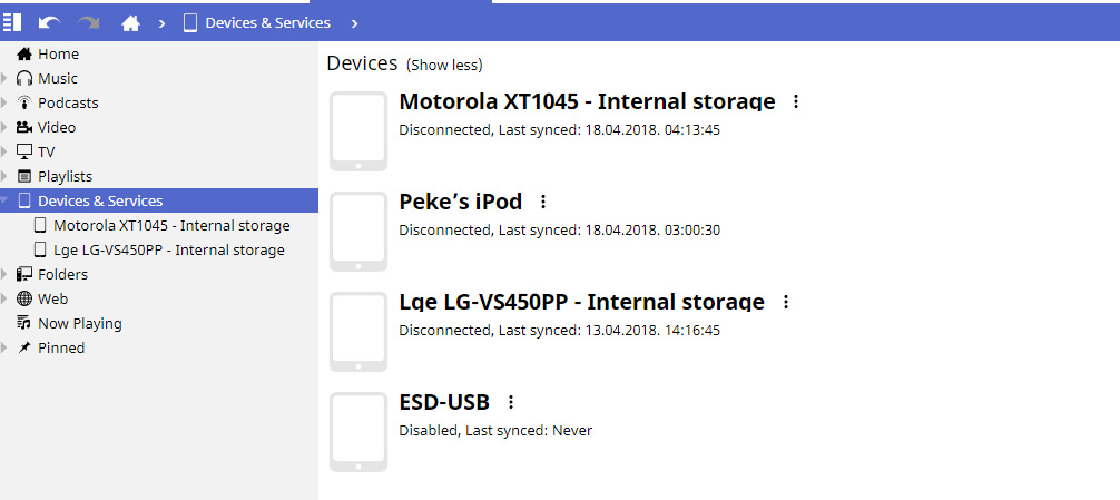 | Description | 1. I noticed that iPod do not show on devices list or when connected (See attached picture) NOTE: It syncs OK so no functionality issue only UI presentation 2. There is no way to determine which Devices are disconnected and which are connected in the tree or in the view. There should be distinctive ways to visually know device status eg. Connected, Disconnected, Syncing(Includes WiFi), Disabled, Newly Added (to let user know it is not yet setup to sync) 3. There is no Way to Disable Device like in case of External HDDs that are/to be scanned into library and not to be used as portable sync device | ||||