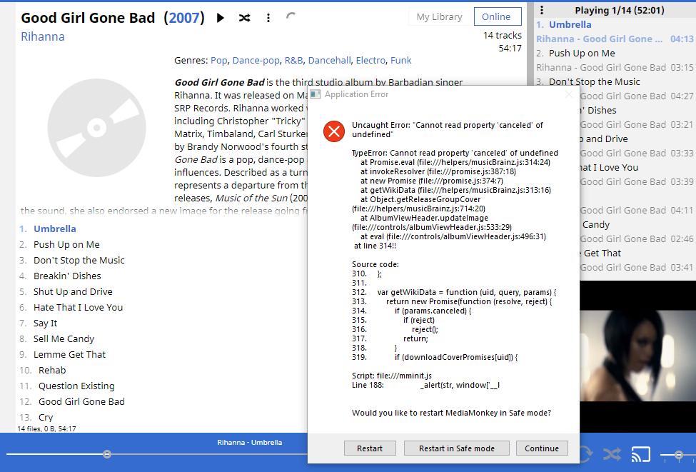 | Description | This occurred as follows: 0 Navigate to Rihanna and switch to Online 1 Right-click Rihanna > Good Girl Gone Bad and press Play Now --> playback starts 2 Click Rihanna > Good Girl Gone Bad --> Album Opens, but error appears (see attached) | ||||