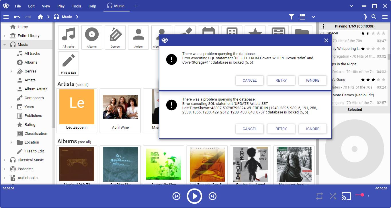 | Description | With build 2116, I'm sometimes getting DB errors on startup OR freezes ('There was a problem querying the database'). The attached debuglog was generated as the errors occurred. The log below was generated after clicking 'cancel' in the error dialog: Log ID: 8877A7BC Note: MM will sometimes work fine initially, but then the hourglass appears (presumably to update album art or podcasts) resulting in these errors/freezes/crashes. | ||||