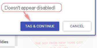 | Description | This is related to #14224 issue rr) - the disabled 'Tag & continue' button appears enabled! Rather than just hiding the shadow, the button should be greyed out. e.g. https://material.io/design/interaction/states.html#disabled Note: this should apply for all themes. | ||||