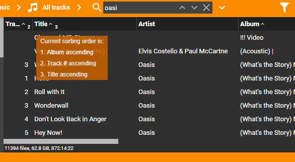 | Description | The default tracklist columns sort is [Album artist, Album, Disc#, Track#, Title], BUT the default columns visibility is ['title', 'artist', 'album', 'date', 'genre', 'rating', 'length', 'bitrate', 'source', 'path', 'filename', 'lastPlayed'] So the 'Album artist' is the main sort column, but it is invisible by default (tested by deleting persistent.json file and run MM5), see: https://www.dropbox.com/s/mfrgytelivd7m90/Screenshot%202019-03-19%2018.54.39.png?dl=0 This becomes problematic mainly with regard to incremental search, when the "power scroll" is performed within the 'Album artist' column that is invisible by default though. But also looks strange on first run (having no idea what is the first sort column). Solution A: Replace 'Album artist' column by 'Artist' column in the default sort (like in MM4) Solution B: Hide 'Artist' column by default and show 'Album artist' column instead | ||||