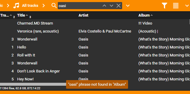 The actual bug would seem to be that MM is _sorting_ on a field that isn't visible and there's no way to understand what that sort order is. In other words, before the user gets confused about incremental search, they'll be confused about why tracks are displaying in a particular sort order! The problem is even worse in 'Simplified list' view because: a) the user doesn't have any way of displaying the columns that might help them understand the sort order b) if the user changes the sort order, there's no way to change it back to the original sort order ('Reset sort order' seems to change it to a different sort order, but not to the original sort order) A solution to all of these problems is to add a 'Sort by' context menu. e.g. Sort by > o Album Artist/Album/Track# . Album Artist/Year/Album/Track# . Year/Album Artist/Album/Track# . Genre/Album Artist/Album/Track# . Date added / Album / Track# ----------------------------------------------------- Define custom sort... (future??) With this approach, if any of the preset sorts were active, the user can see what they are. And if the user initiates a sort by clicking a column, it overrides the preset, but the user can revert to any of these presets and know what they'll be reverting to! So although C. solves a consequence of the problem, it doesn't solve the actual problem. |