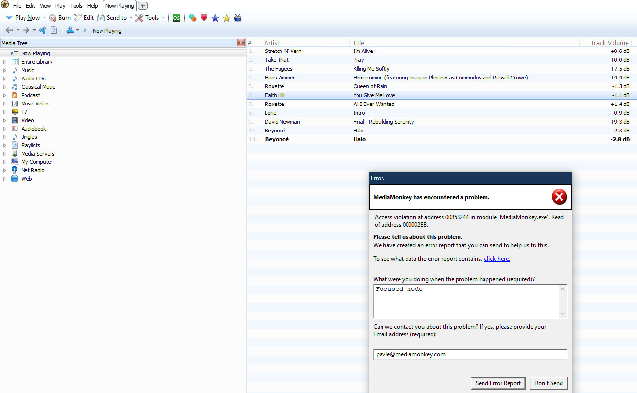 | Description | When user quickly navigating Now Playing List to edit look files using TAB/SHIFT+TAB and F2 with Arrows can trigger Crash. In rare cases Crash Dialog shows in most cases only AV shows. It is not reproducible when using mouse. Video of crash on user PC is uploaded, LOGs from previous session are in Ticket. I can't reproduce in MM5 at all, also can't be sure of exact steps as sometimes crashes after 15 minutes and sometimes after 30 seconds, so no exact steps as keys for navigation needs to be normally without exact key press order. | ||||