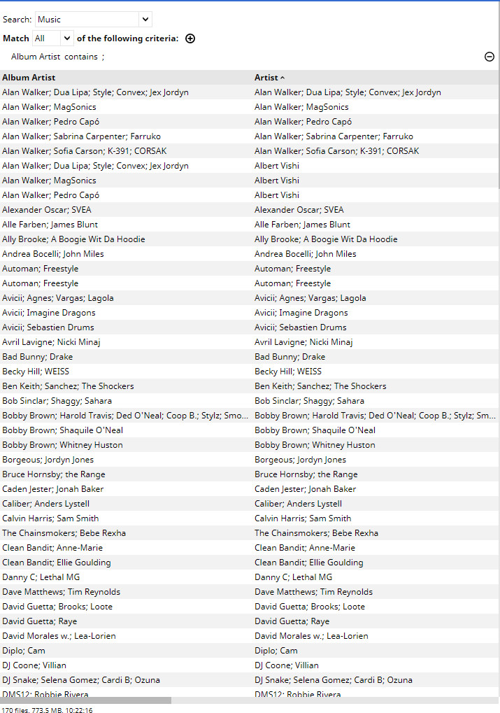 on attached picture you can see that some tracks have multiple artists there is no way to search for ARTIST is KNOW and have MULTI ARTISTS (More than 1 artists per track). I have Tried searching Artist -> Contains -> ";" but it ends empty as ";" is separator for multiple Artists. Searching individual Artists works eg. Artist -> Contains -> David Guetta or Jack Black |