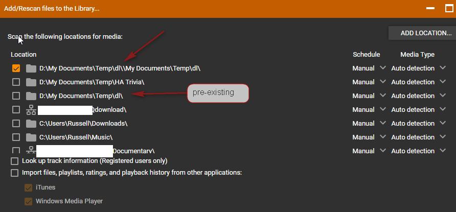 | Description | A) 1 Navigate to Music>Location>D:/X/Y/Z 2 Navigate up one directory i.e. to Music>Location>D:/X/Y 3 Navigate down (using back arrow) to Music>Location>D:/X/Y 4 Press INS to scan the directory --> MM pre-checks D:\X\Y\\X\Y !! B) I saw on a couple of occasions a similar/related bug 1 Navigates to Music>Location>D:/X/Y/Z 2 Navigate up one directory i.e. to Music>Location>D:/X/Y 3 Press INS to scan the directory --> MM pre-checks D:\X\Y\Z !! Note: I haven't been able to replicate this consistently--I think that my repro steps aren't quite right. Hopefully the fix to A will give you a hint about what might have happened with this test case. | ||||