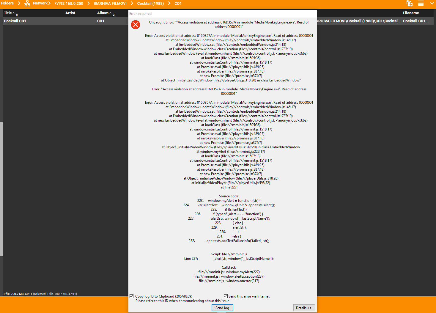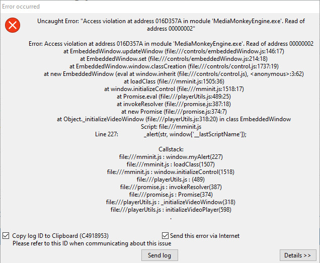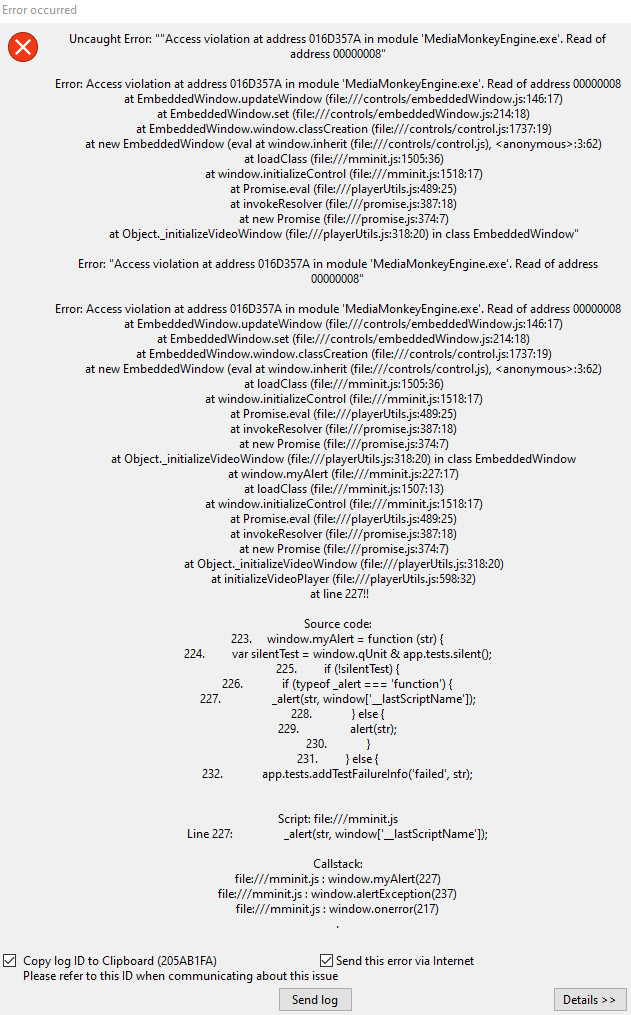 | Steps To Reproduce | 1. Start MM5 2. Add some video files (Folders -> Network -> NAS, AVI Type in my case) along with audio files to Now Playing 3. Start playing Audio and skip to Video file 4. MM5 white screen crash after few logs sent. | ||||