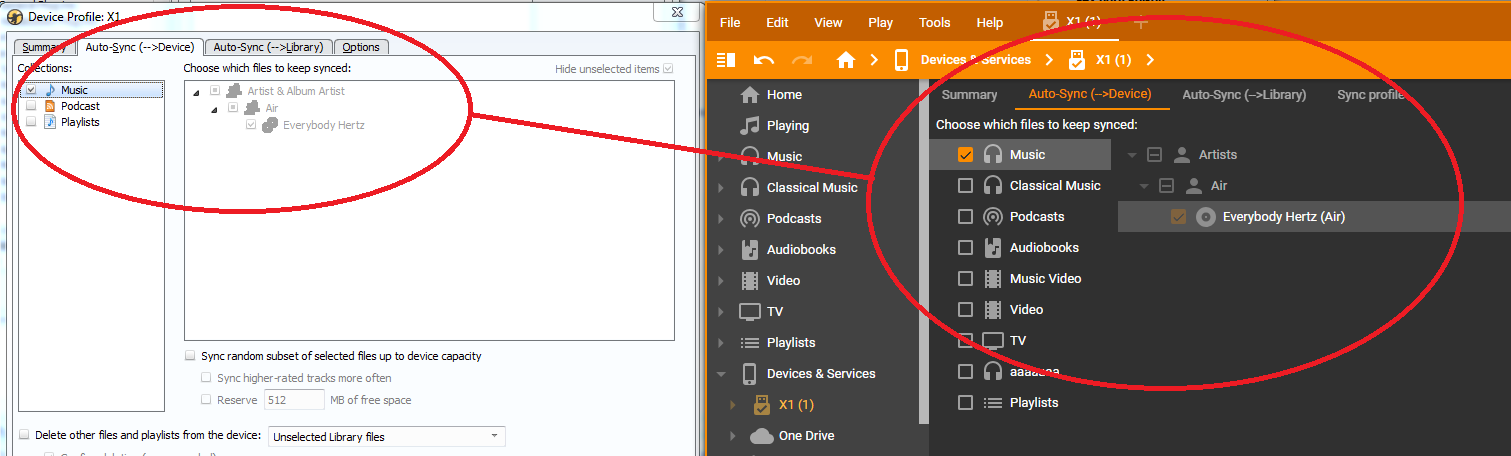 Re-opening as I've figured out the repro steps for issue 1) 1 Check 2 Artists in MM5 sync list 2 Run MMA and verify that the 2 Artists are checked in the sync list 3 In MMA check a 3rd artist and back out to the main screen 4 In MM5, uncheck 'Artists' so that all individual artists are unchecked --> In MM5, Artists and all child Artists become unchecked, but 'Music' remains 'partially' checked even though no content is in the sync list --> In MMA, the Artist that was added in step 3 remains checked, and will sync despite the fact that MM5 shows no Artists in the sync list https://www.screencast.com/t/kuQLarcikS |