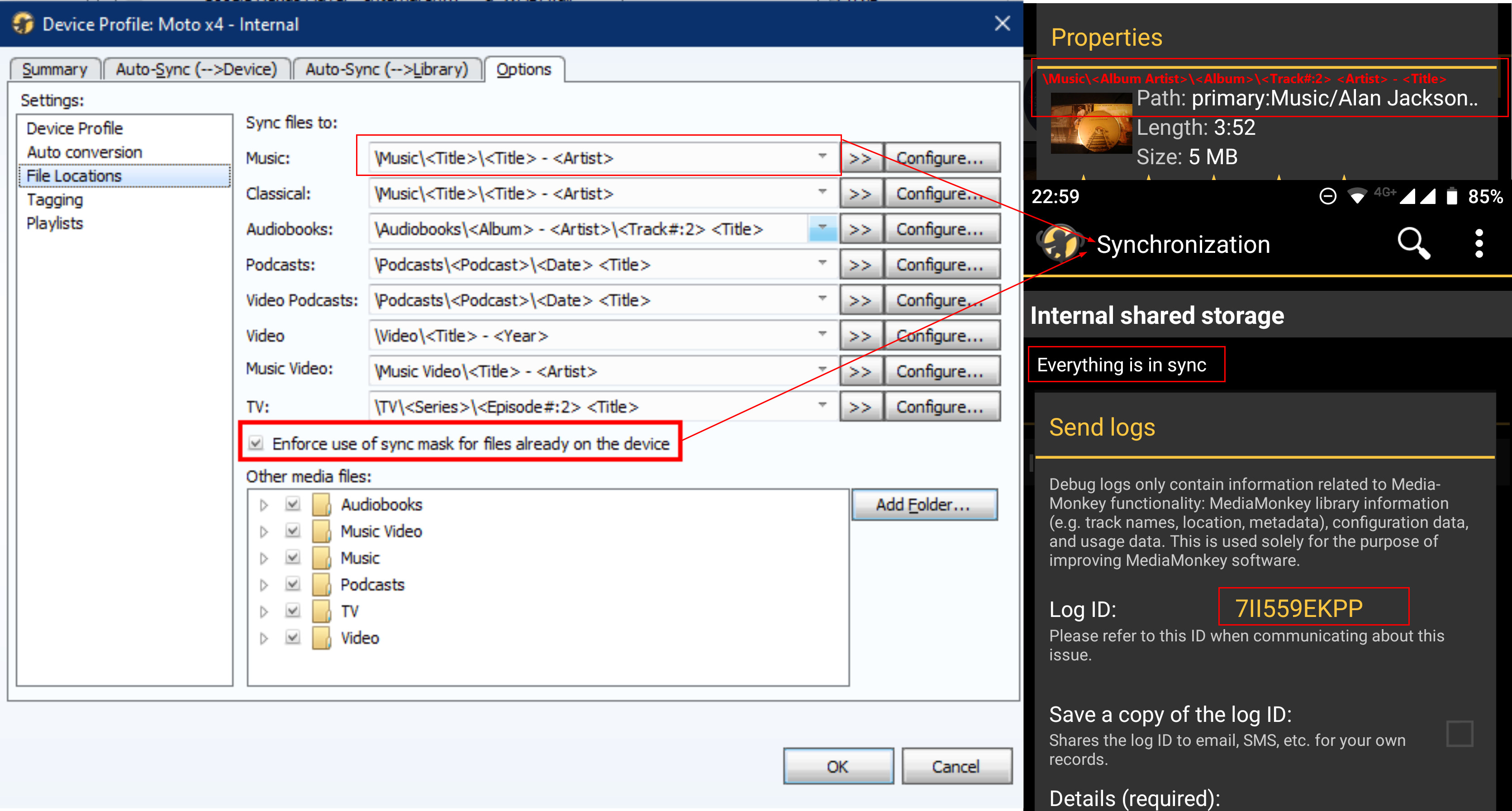 | Description | If User Sync WiFi while Using Enforce Mask for existing, then Mask is not enforced. Only New syncs have correct mask. Attached picture with: - Sync settings and Mask from MY MMW - Track Properties/path Mask before WiFi Sync - Confirming that after WiFi Sync all is in sync - Log ID Sent after confirming that Track Properties/path is same eg. Track path not enforced | ||||