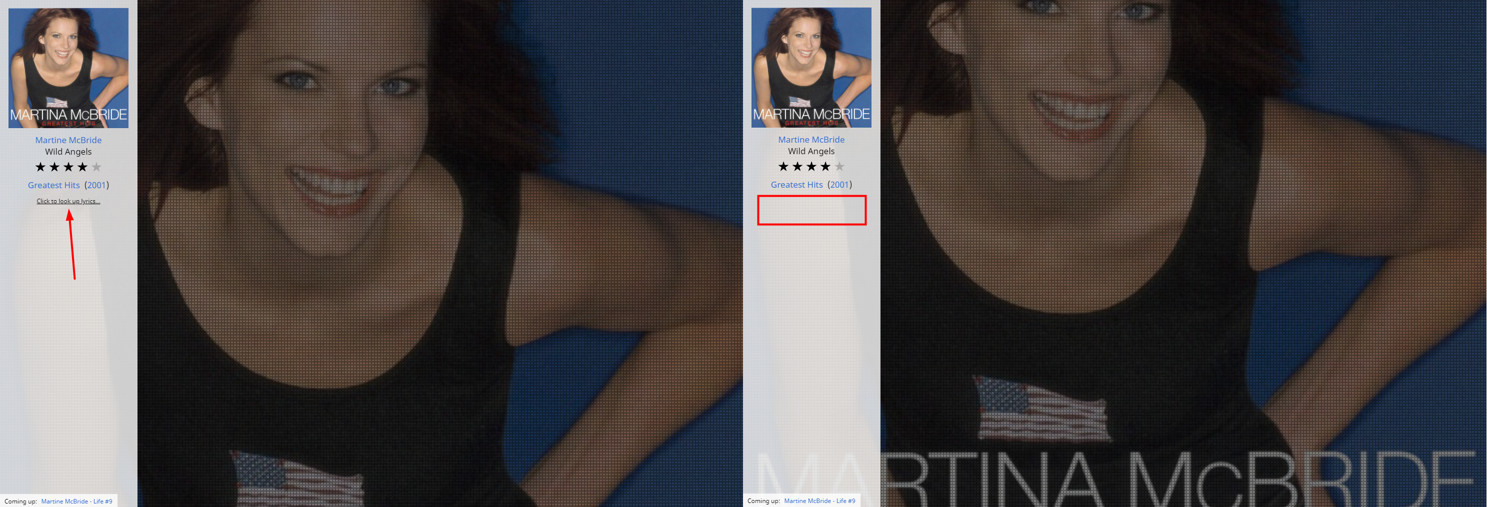 | Description | In Playing view Mode Album art if user clicks Lookup lyrics it disappear if no lyrics found. It should either show no Lyrics found like in Playing -> lyrics view or enable Edit so that user can manually Copy/Paste lyrics in track properties. | ||||