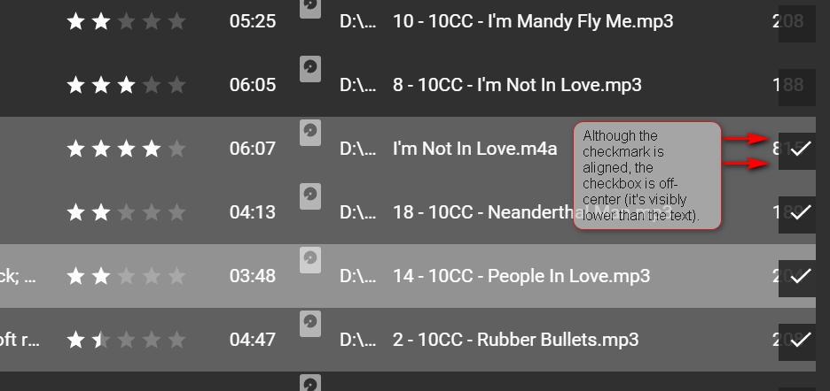 Although the multi-selection checkmarks are now aligned in list views, several alignment issues remain: 2) In list views, the multi-selection check _boxes_ are still misaligned (see the attached image) 3) In grid views, the multi-selection check marks / check boxes don't appear in the corner as expected (see attached) 4) In list views, the Album art appears above the center-line (see attached) Aside: List view checkboxes would look much cleaner if they weren't super-imposed on the text (see attached example). Is this possible? |