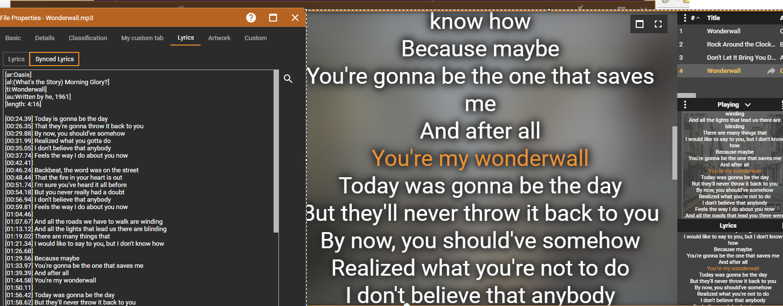 https://lrclib.net/ looks like a good lyrics source for both synced and unsynced lyrics Getting synced lyrics from https://lrclib.net/ and auto-scroll then in Playing and Preview would be really nice and useful feature for the next MM version Example query: https://lrclib.net/api/get?artist_name=oasis&track_name=wonderwall&album_name=%28What%27s%20the%20Story%29%20Morning%20Glory%3F&duration=259 Added as Lyrics source (just plain lyrics for MM 2024) as 0021181 |