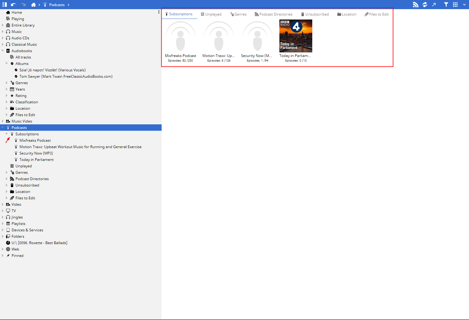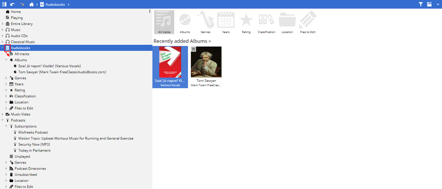 | Description | 1. Unlike podcasts where instead of Album we show Podcast and Album is in all UI elements replaced as Podcasts (Including Tree Icons , Search, Properties, ...) Audio Books are handled and Normal Music Albums, We should change that and for Audio Books we should do the same (Including Tree Icons , Search, Properties, ...) Audio Books should be handled more like Podcasts and have similar options/view where there will be clearly shown what was unplayed, downloaded, Audio Books Directories, ... as it will improve user experience. Attached both Audio Books and Podcast browser pictures showing differences. 2. In Advanced Search also do not have criteria AudioBook where Podcast is available. Not sure about other types but Audio Books and Podcasts are specific. | ||||