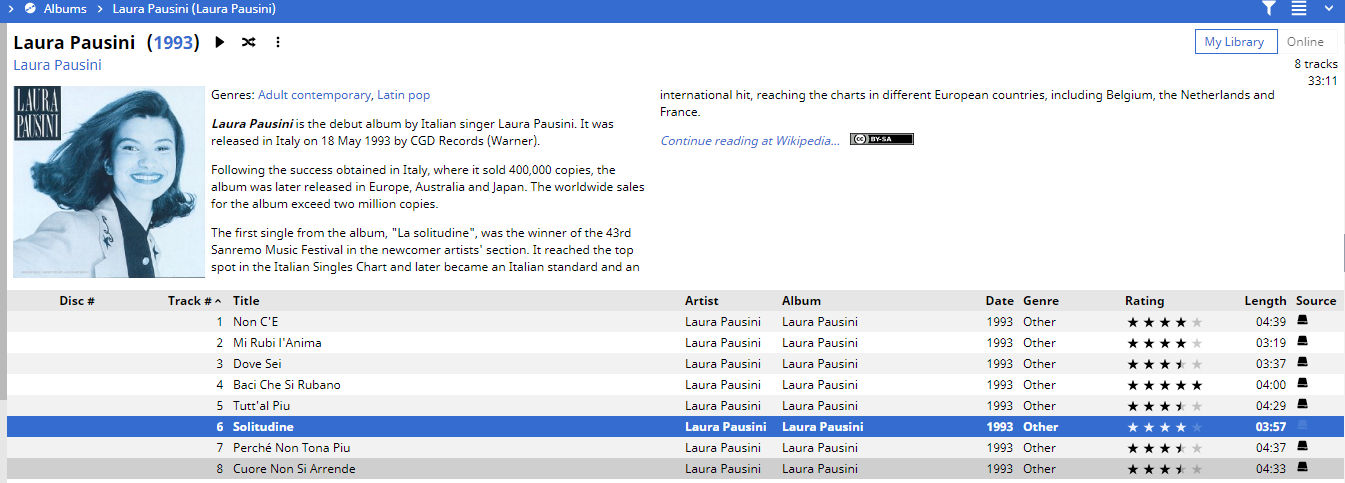| Description | 1. If you try to do an Auto tag on some correctly Albums MM5 tries to tag it incorrectly (bug16597_1_autotagresult.jpg) where track 6 is only one that should be changed (bug16597_1.jpg). Album info at https://en.wikipedia.org/wiki/Laura_Pausini_(1993_album) 2. Some Albums hen seen as album shows completely different info in Chinese (bug16597_2.jpg) and when clicked continue on Wikipedia takes you to Spanish version of album https://es.wikipedia.org/wiki/Las_cosas_que_vives_(%C3%A1lbum) even that search English Wiki by Artist and album name return correct album info https://en.wikipedia.org/wiki/Le_cose_che_vivi . | ||||