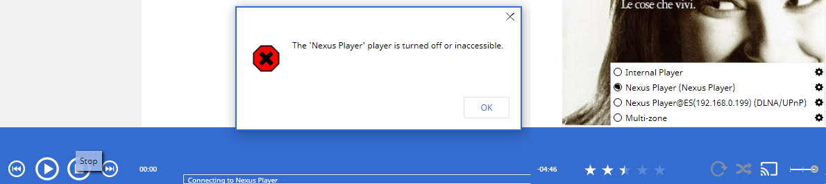 In Step 2 I unplugged Nexus player from power to force shutdown and in Step 3 "3. Nothing happen it looks like all is ok on MM5 player like Nexus player is available" MM5 continued to play normally like Nexus player is not disconnected. So I stopped playback Switched to internal and played track -> Switch to Nexus player Constant Nag screens like MM5 can't connect to Nexus player -> OK Next track starts to play -> Nag Screen -> Ok Next track Starts to play -> Nag Screen -> ..... There is no way to press stop as Modal dialog is on top. I pressed stop on keyboard and then manually downgrade to internal player. It should be automatic? That is why I suggested that Nexus player gets grayed and not selectable and that Internal player is selected Automatically. If you do same when using USB sound card It is Auto Stopped and Switched to next default sound card on next playback no need for manual change. Chrome cast behavior should be same as Chromecast device is just another output as any other sound card and behavior should be same. |