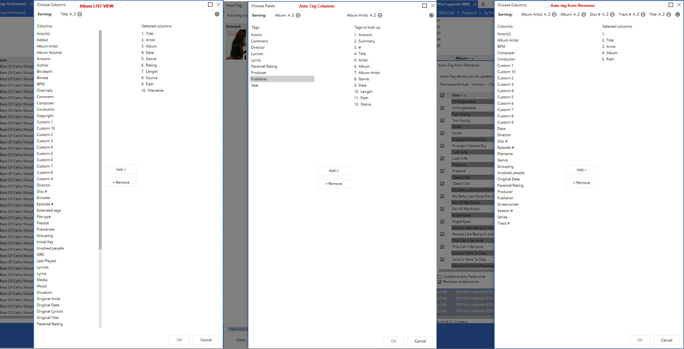 All Classical Music fields are missing, which is why I suggested that Columns viewed are copied from view that initiated Auto-Tag. (I know that they are mapped but column names should reflect view) Also Column view can be automated as pointed in ~58226 as a result of resolving points 2 and 11 from 0016294:0058227 which would act as auto column pre select view columns based on last user view which initiated Auto-Tag. Also it would further make maintain of code easier. |