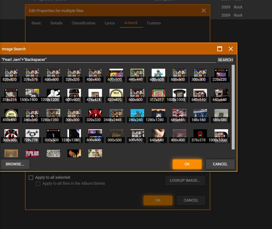 Fixed in build 2261. Artwork list in properties dialog preserves original size now, as it is not grid. Size of images in image lookup dialog now corresponds to changes in Image size setting immediately without need for restart. |