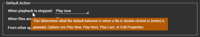 The current wording is correct, however, the tooltip is missing (the string exists--it just doesn't appear): This determines what the default behavior is when a file is double-clicked or [enter] is pressed. Options are Play Now, Play Next, Play Last, or Edit Properties. Also, minor tweak: the combo boxes for the default options are positioned too far to the right. They should be next to 'When playback is stopped:'. |