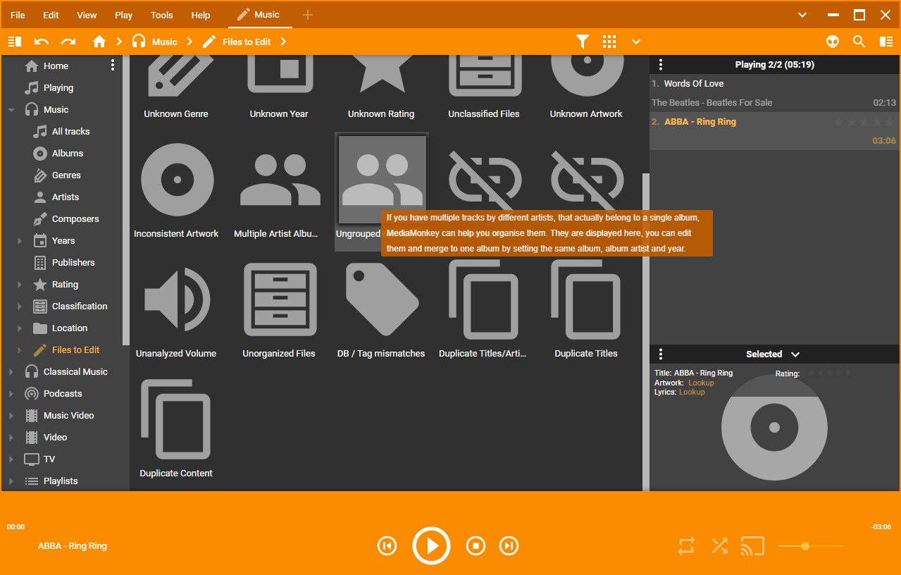 | Description | Navigate in the tree to Music > Files to Edit > Ungrouped multiple artist albums and hover --> tooltip displays Navigate in the main panel [Grid] to Music > Files to Edit > Ungrouped multiple artist albums and hover --> tooltip fails to display! Note: I haven't tested whether this issue affects many other nodes--I just happened to notice it with this one. | ||||