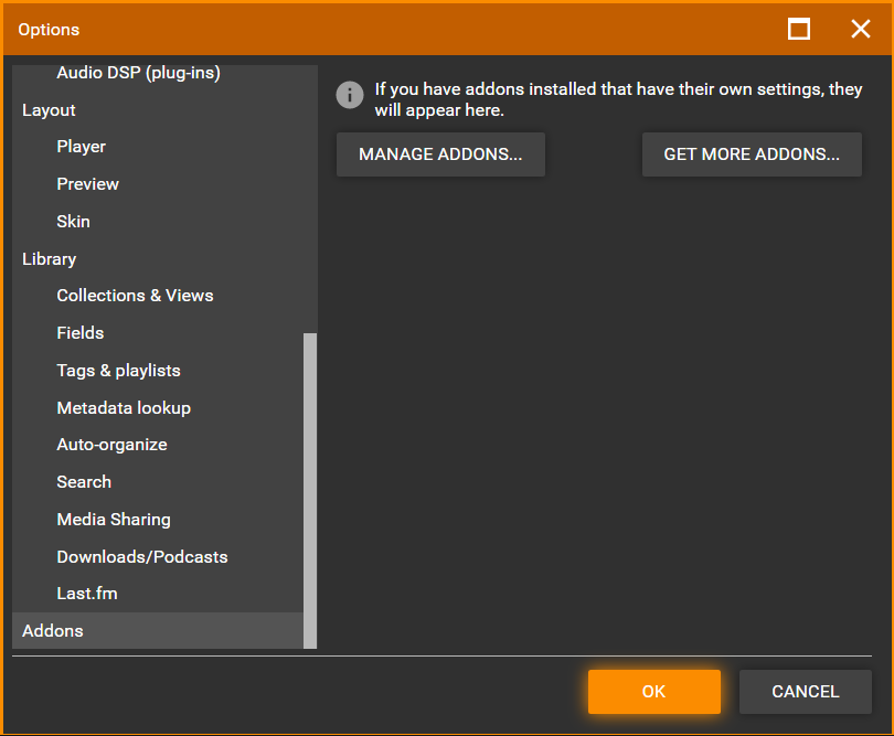 Oh! I didn't realize that Auto-DJ had its own "custom" panel in Options. Note that the Auto-DJ addon configuration panel is extremely simple (..and has a typo, lol). I think that the developer would want to choose whether to put their settings inside the "built-in" Addon Config panel (the one specified in info.json) or if they want to manually place their settings elsewhere in the options (via dlgOptions_add). So in the case of Auto-DJ, since it has its own panel under Options > Player > Auto-DJ, we should probably remove the "built-in" config (which only has a "Play counter threshold" option), and put the play counter threshold option (which is the only option inside the Addon Config panel) into Options > Player > Auto-DJ. Also, I forgot to mention this to you earlier, but there's a bug related to addon config that I reported the other day, which is a quick but important fix: 0017156 |