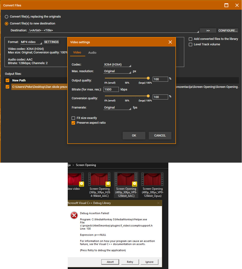 | Description | Conversion of video file crashes MM Several Logs are sent with LOG ID ABBA6157 crash images attached Files are uploaded on FTP. | ||||