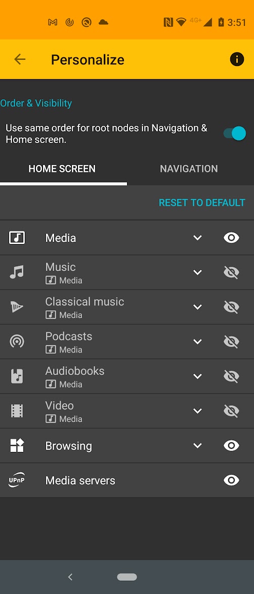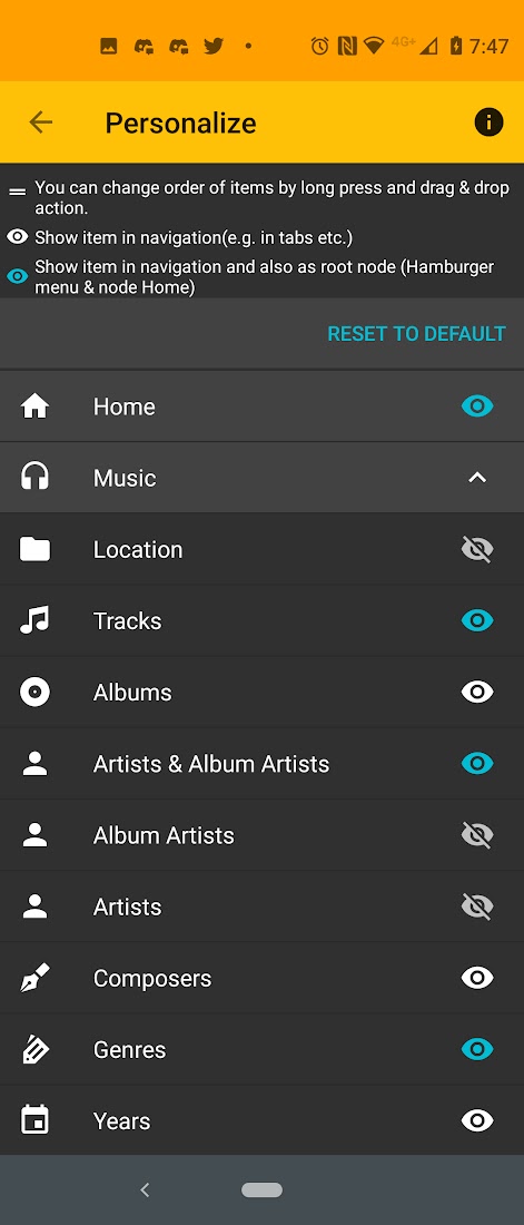 A new approach in 2.0.0.1011 build 1) only one screen for both navigation & home view 2)For root nodes without subnodes (e.g Playlists) there are just visible or invisible state 3)For child nodes like "Tracks" from "Music" there are three visible states. (Crossed out eye)1. INVISIBLE e.g. "Album Artists" node is invisible by default (White eye)2. VISIBLE - default for most nodes (Blue eye)3. VISIBLE AS ROOT - In this case, we can define what nodes will be accessible directly with one click from the navigation menu if only one subnode will be VISIBLE AS ROOT, then this node will be represented by the parent group in navigation. e.g. "Composers" from "Classical music" will be the only node VISIBLE AS ROOT by default. So in navigation, we will see "Classical music" which directly leads to "Composers" if there will be more subnodes selected e.g. "Tracks", "Artists" & "Genres", then all nodes will be visible in navigation with group indicator where those belong to. more info by new attached screenshots |