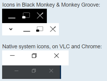 | Description | I've thought for a while that the icons on Black Monkey and Monkey Groove look a bit too quirky, and that they should be changed to be more standard, to have a native appearance. See screenshot. For users that prefer the existing icons, we can make an addon that brings them back. | ||||