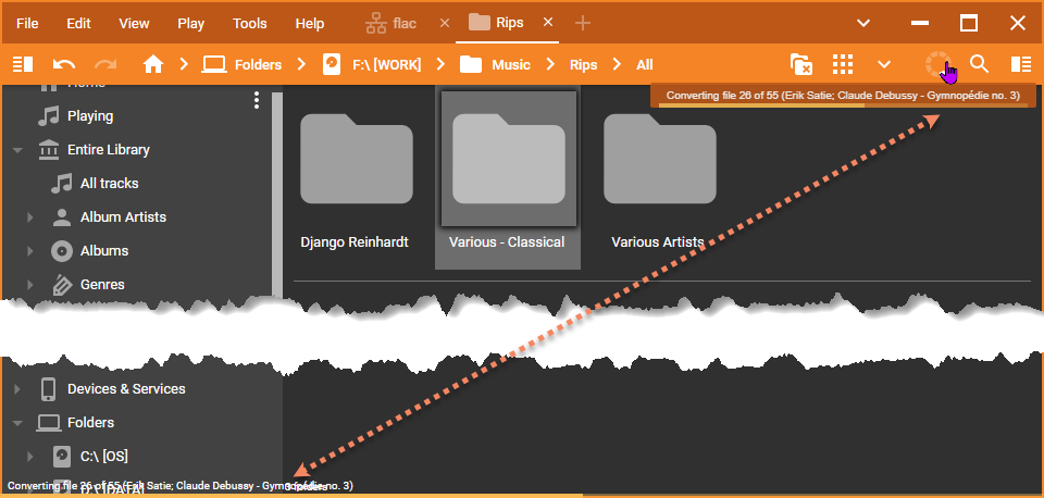 Steps 2: 0. Disable Bottom Panel in View menu 1. Have monitoring on startup enabled on large drive like c:\ 2. Close MM on Large Auto-Playlist (one from example have 200k of tracks so it takes several seconds to populate) 3. Restart MM 4. Once Auto-Playlist gets populated It removes Status line and other background job overlays main screen See attached Image. NOTE: It is timing issue and it is hard to replicate on short background jobs as only one is shown in status bar or even if it overlays it gets closed very soon. |