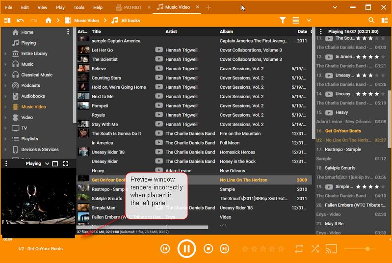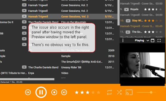 | Description | 1 Change the aspect ratio of the Preview window in the right panel (this is key to replicating the bug) 2 Play a video --> it plays in the Preview window as expected 3 In tools > options > layout, disable the Preview Window 4 In tools > options > layout, move Preview to the Left panel 5 Play the video --> it plays in the Preview window, but has artifacts. It either: i) renders the frame incorrectly as shown in the attached images ii) it 'slides' up from the bottom when it begins playing, but renders properly 6 In tools > options > layout, move Preview back to the Right panel 7 Play the video --> it plays, but with the previously described artifacts 8 Resize the Preview windows to the minimum size in both the right and left panels and play videos at both locations --> The artifacts no longer appear | ||||