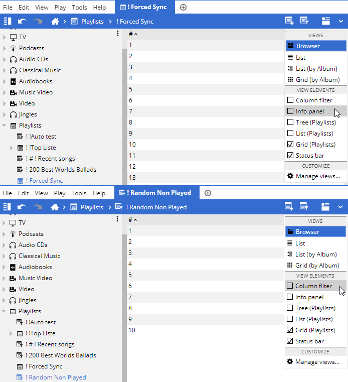 | Description | Disabling Info Panel in Playlists, removes Edit option from Playlist view and only way to edit Playlist is to right click on Tree node -> Edit. 1. I would Add Edit Playlist icon along with New Playlist and New Auto Playlist icon 2. I would Add Edit playlist also in context menu | ||||