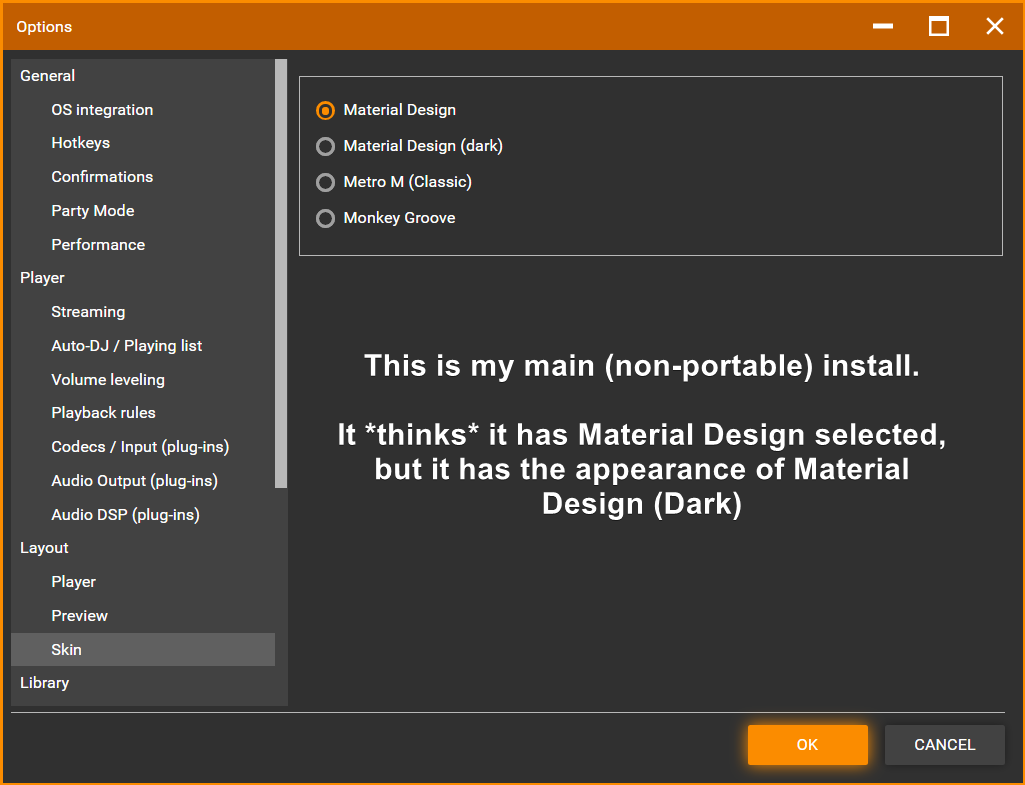 | Steps To Reproduce | 1) Install the "Material Design Compact" addon (attached) on your non-portable install. Switch to Material Design (Dark). [I'll explain why in a bit.] 2) Open a non-portable install. 3) On non-portable, switch from Material Design Dark to Material Design. 4) After complete, go to your non-portable install, and close + reopen. - Non-portable has now switched to the appearance of Material Design. - The "compact" appearance has now gone away, even though the addon is still installed. (This hints to me that the portable install, which doesn't have the addon installed, is somehow giving the non-portable install its compiled LESS.) - When you open the Skin options panel, it will say that Material Design (Dark) is still selected. | ||||