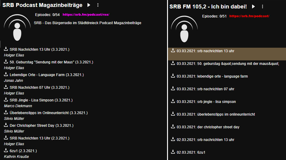 | Description | During testing of 0017603 I have found out that https://srb.fm/podcast/rss/ and https://srb.fm/podcast/ both Subscribe to podcast, but they subscribe differently (attached picture). We should consider if normal HTML file is detected to append "/rss" and/or "/feed" to URL as in 99% of cases it will return RSS page of URL. (Tested on Many pages and various CMS platforms that have some sort of listing no matter if they are Podcasts or just news feeds, history, Blogs, ...) | ||||