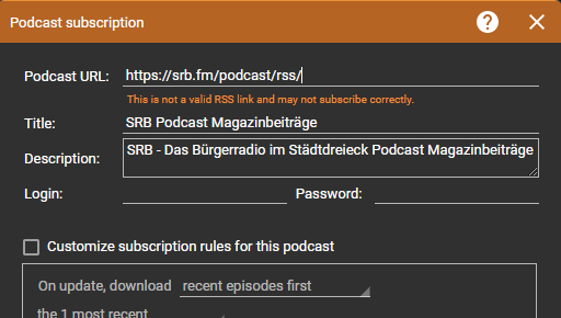 Majority of mine podcasts have no /rss/ in the path, but rather .rss as extension, e.g. https://api.rozhlas.cz/data/v2/podcast/show/6482952.rss We could maybe add a message/warning when the link is not a link to RSS feed, i.e. whenever it does not include <rss> element. Something like: "The link %s is not valid RSS link, it may fail to subscribe correctly" Assigned to Rusty for wording. |
