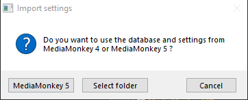 Alternatively, we could use the following approach which eliminates the need for users to find the directory of the _next_ most recent settings/database (though I believe that the previous suggestion is simpler and meets the needs of the majority of cases which are presently upgrades from MM4). Do you want to use the database and settings from %s [Yes] [Select folder] [Cancel] And clicking [Yes] --> Restore: [MediaMonkey 4] [MediaMonkey 5] [Cancel] |