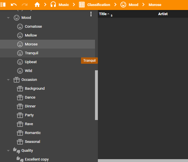 @Rusty: I don't think this is related to genres. Currently when I start MM5 as fresh install with empty DB then I don't see any genres (be it sub to the Genres node or in the Genres dropdown in properties) unless I scan at least one track into database. BUT... I see dozen of empty Moods, Occassions etc. (see attached screenshot) unless I explicitly delete them from the Media Tree as nodes. So I guess that we sould either: 1) Unify this with the other files and show a value only when there is at least one track linked to that corresponding value (preferred?) and thus initially show Tempo, Mood, Occassion, Quality as empty nodes. 2) Leave it as is -- considering that in MM3 times there was a reason to have this predefined sets of Moods, Occassion, Quality ? Just not sure what the rationale was? |