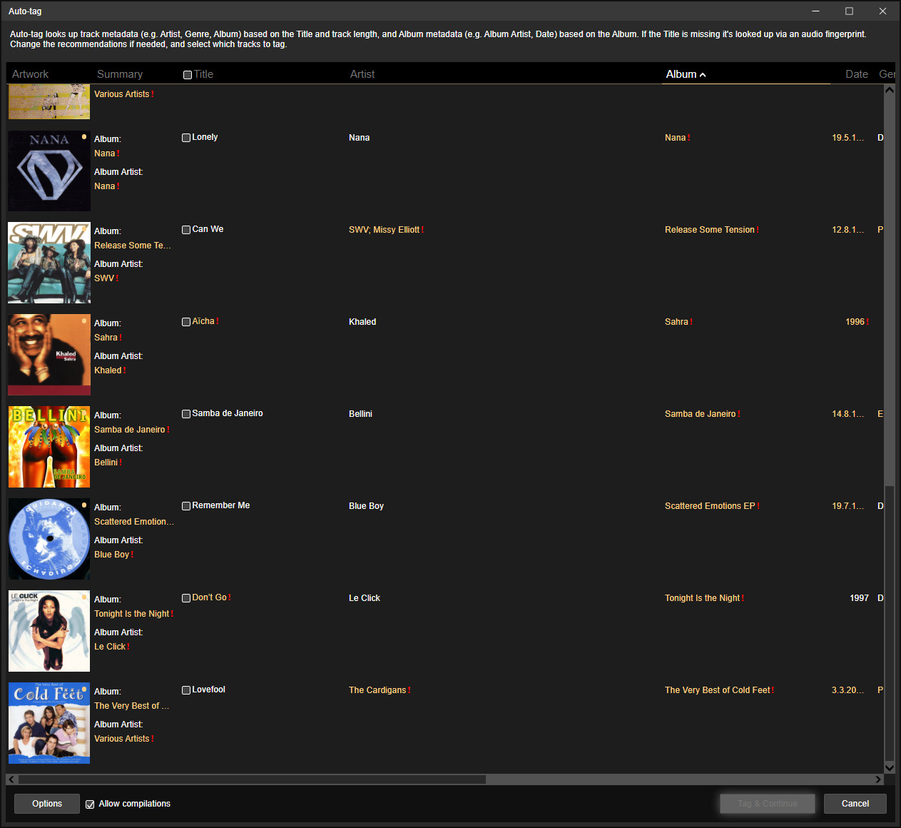 That album is newly added to MB library and most probably not yet replicated to search index ... that's the reason why Auto-tag of the FLAC files are not recognized as one compilation album. Peke mentioned AudioCD was recognized correctly and MBGID is stored to album record in DB during rip. Is it possible to store that MBGID to Links table (with ID to recording, if possible) so it can be used in future in Auto-Tag ? |