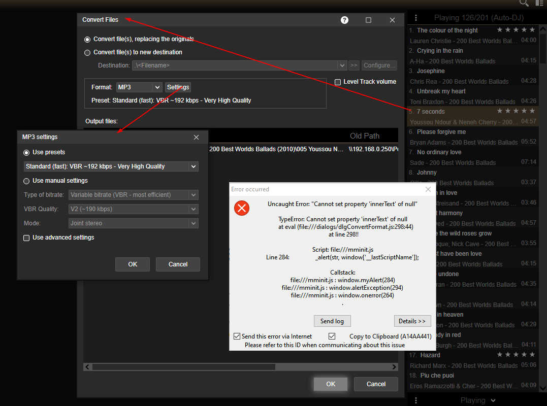 | Description | MM5 crashes when second modal window is opened. It is easy to reproduce: 1. Open MM5 2. Right click on any track -> Convert Format 3. Click on Converted format Settings 4. Right click on Tray Icon -> EXIT NOTE: It maybe affect other parts of MM and it is possible cause of crashing when MM goes to sleep, but can't confirm that. | ||||