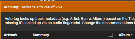 | Steps To Reproduce | 1 Select 114 files 2 Tools > Auto-Tag 3 Enable Title checkbox in Column Headers 4 Click Tag & Continue (no need to have MM finish processing files --> Window title shows Auto-tag: Tracks 201 to 114 of 114 This should be Auto-Tag: Files 101 to 114 of 114. With 250 files it becomes 401 t0 250 of 250, so it seems each Tag & Continue adds 200 instead of 100. Untested on free version. | ||||