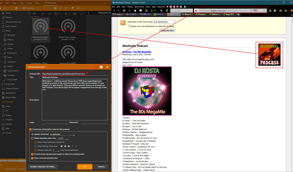 | Description | Podcast Art is not shown in Listing even RSS contain URL to podcast Art. Tested URLs are: http://feeds.feedburner.com/Mixfreaks?format=xml http://music.motiontraxx.com/episodes/motiontraxx.xml https://feeds.transistor.fm/netokracija-office-talks https://feeds.twit.tv/sn.xml | ||||