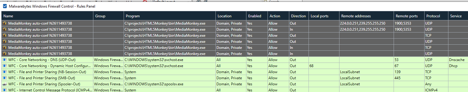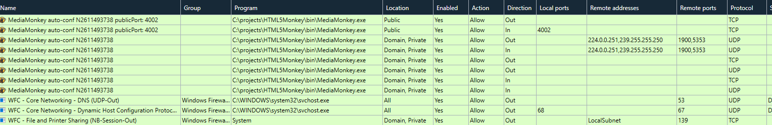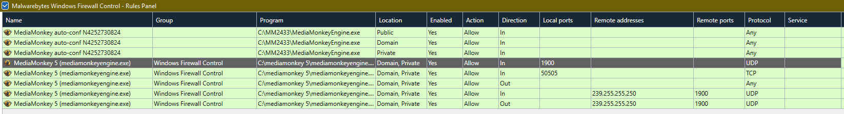 I left C:\MM2433\MediaMonkeyEngine.exe rules as example so that they can be clear from what actually MM5 uses. I tried adding only 6, but Windows Firewall Control complained about 7, 8 rules as 239.255.255.250 is not standard IP range, so once I added them as seen all worked correctly. You are most likely right, that adding 6 only will fix the problem. |