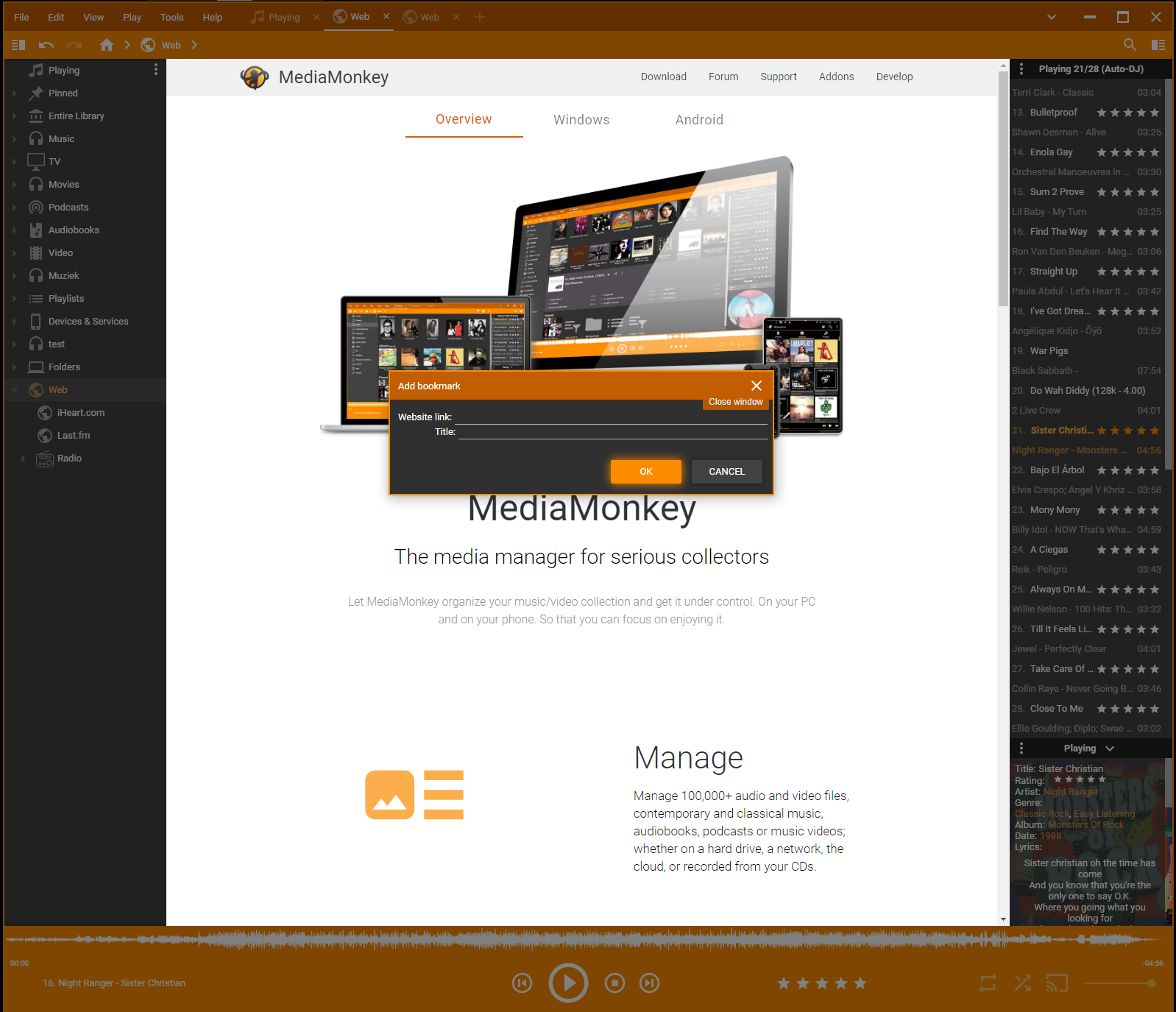 | Description | When adding a bookmark, MediaMonkey dims the Mediamonkey window, but not the webpage in the Filelisting. | ||||