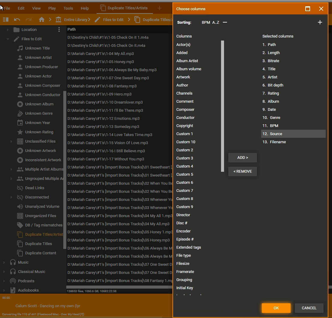 In Files to edit -> Duplicate Artist/Titles it is very useful to have Extensions column available. funnel filtering is not enough as it excludes other extensions. There is no possibility to simply sort Title -> Artist -> Extension which will make things easier for deciding which to keep and which duplicate to delete. Especially if you put Extension as first Column. |
