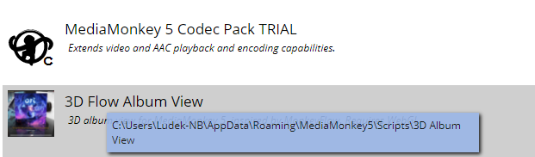 Default paths for core addons: [MM5 install folder]/scripts/ [MM5 install folder]/skins/ [MM5 install folder]/plugins/ [MM5 install folder]/layouts/ For user installed addons (portable version): [MM5 install folder]/portable/scripts/ [MM5 install folder]/portable/skins/ [MM5 install folder]/portable/plugins/ [MM5 install folder]/portable/layouts/ For user installed addons (regular version): C:\Users\Ludek-NB\AppData\Roaming\MediaMonkey5\scripts\ C:\Users\Ludek-NB\AppData\Roaming\MediaMonkey5\skins\ C:\Users\Ludek-NB\AppData\Roaming\MediaMonkey5\plugins\ C:\Users\Ludek-NB\AppData\Roaming\MediaMonkey5\layouts\ |