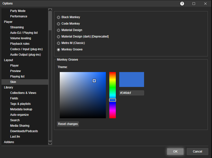 1) Good point.... I think there's a difference between the two. For Material Design, I think "Color theme" applies, because it's a theme based around multiple different colors. But Monkey Groove only uses a single color. Perhaps Monkey Groove's could be changed just to "Color"? The word by itself could prove useful in other contexts in the future. 4) Fixed |